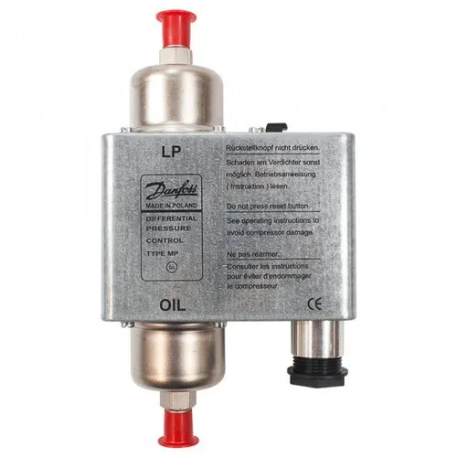 MP 54 and MP 55 are used in refrigerating systems using HCFC and non-flammable HFC refrigerants. MP 54 has a fixed differential pressure setting. It also incorporates a thermal time relay with a fixed release time setting. MP 55 have adjustable differential pressure and are available with thermal time relay.
